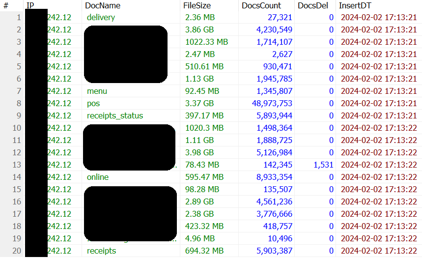This server, an Elastic Search server, happily produced all of it’s tables with a single probing query (to confirm the data pulled from third party sources). The server responded by providing me with a number of different table names, such as “Delivery, pos, receipts, online, menu”, indicating that this may be a hospitality service, possibly a restaurant or takeaway. The table name insinuated that a lot of personal information would be held, especially as the data set is over 10GB in size.